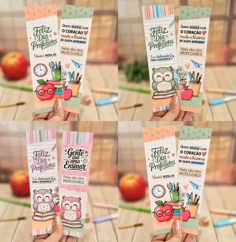 Celebre o Dia dos Professores com estes encantadores marca-páginas criados com carinho! Perfeito para presentear educadores ou incrementar seus projetos especiais, este conjunto traz designs exclusivos que transmitem gratidão e reconhecimento.