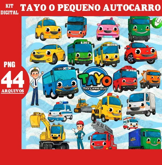 Kit digital com 44 elementos PNG do personagem Tayo para criar projetos personalizados com qualidade profissional! 🚗✨